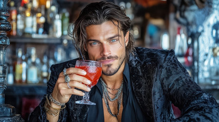 A stylish man with long hair enjoys cocktail in bar setting