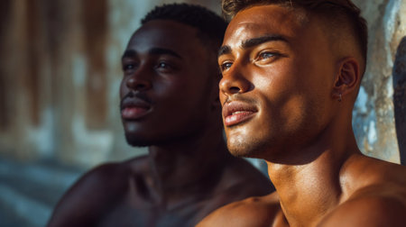 Fashion portrait of young male models. Muscular strong men. Athlete from a beautiful body. Beautiful young mans naked torso. Two shirtless athletic naked guys. Man vogue.