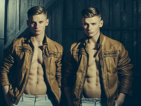 Young man sexy muscular bodybuilder macho with bare torso stylish haircut while twin brother poses outdoor on blurred background