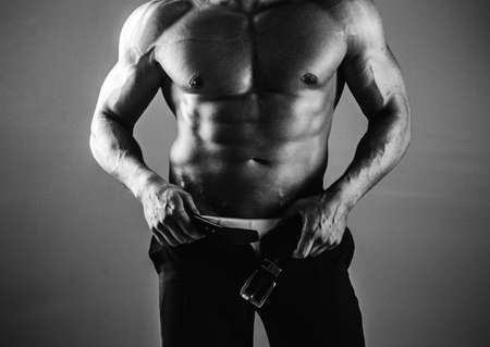 Muscular Gay sexy with six pack abs in studio with dramatic lighting against a dark background. Men abs. Fitness abdominal muscle. Man six pack.