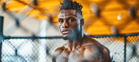 Strong mma fighter showing his muscles inside a cage