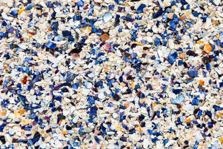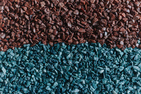 Blue marble fine gravel. Simple stone background with blue pebbles. Stone texture. Top view of ground decor for garden with colorful natural stone
