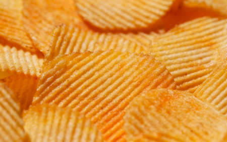 Texture fried golden brown potato chips, close-up background