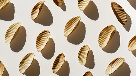 Ridged potato chips in various sizes spread out in a random pattern across a white background, with shadows adding depth.