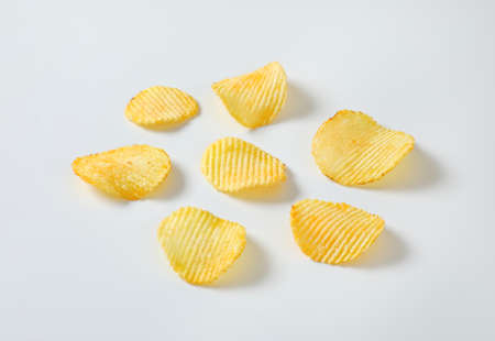 This image features a collection of crispy potato chips arranged on a white background. The chips are golden brown and have a wavy, ridged texture. The white background provides a clean and contrasting backdrop, making the chips the focal point of the image. This image is ideal for use in food photography, advertising, or culinary websites.