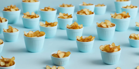 A vibrant and aesthetically pleasing arrangement of crispy potato chips on a bright turquoise background. Perfect for food photography and snack presentations.