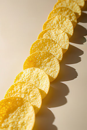 A stack of potato chips on a yellow background resembles a petal with tints and shades of peach. Perfect for macro photography or as a fashion accessory in cuisine