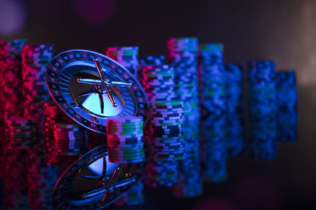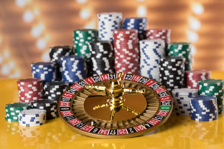 Gambling theme. Roulette and poker chips on colorful bokeh background.
