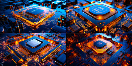 A detailed image displays multiple computer processors arranged on a circuit board. The processors have black and gold tones, set against an intricate network of gold circuits. The composition uses an overhead perspective, with focused lighting, offering a view of modern technology. Suitable for use in design or editorial projects.