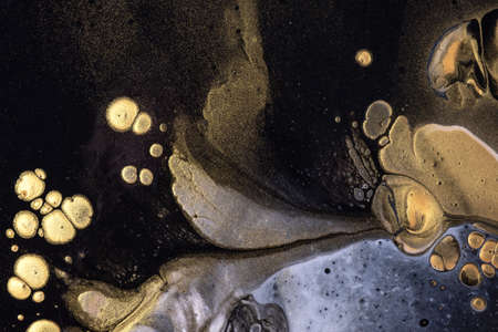 Abstract fluid art background black and golden colors. Liquid acrylic painting on canvas with gray gradient and splash. Watercolor backdrop with wavy pattern.