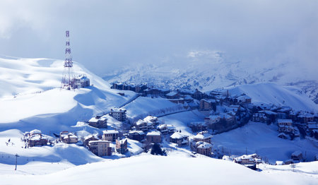 Photo of luxury winter resort, Christmas and New Year holiday, countryside lodges covered with white snow, Faraya mountains in Lebanon, cold frosty weather, snowy mountain landscape