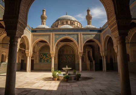 Serene courtyard with ornate arches, colorful tiles, and central fountain in traditional Islamic design.