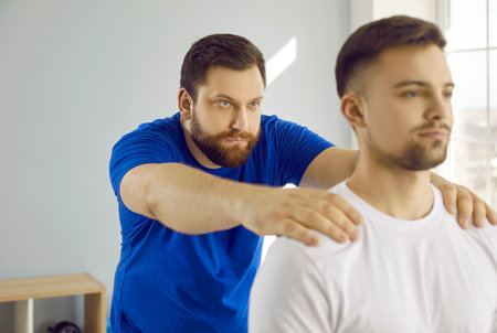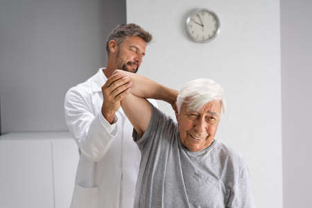 Doctor physiotherapist assisting a male patient while giving exercising treatment massaging the shoulder of patient in a physio room, rehabilitation physiotherapy concept.