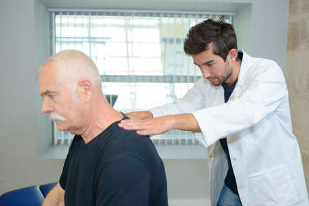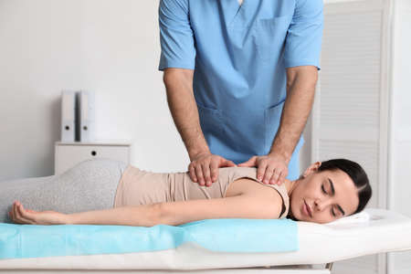 Chiropractor massaging a young man shoulder. Concept of physiotherapy and recovery from an injury.