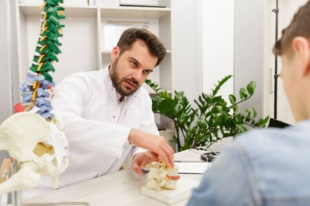 Doctor showing flexible spine model to his patient and explains the cause of his pain in medical office. Patient visiting physiotherapist in clinic. Surgery, healthcare and medicine concept.