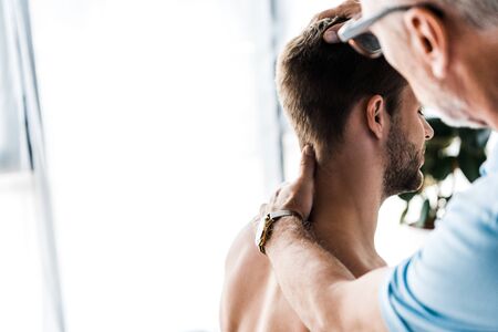 selective focus of doctor touching neck of shirtless man sitting in clinic