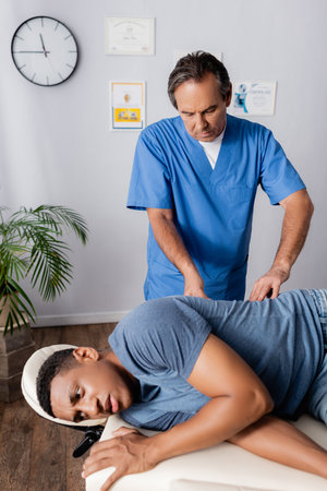 middle aged chiropractor working with african american patient on massage table