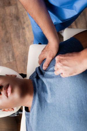 high angle view of masseur massaging african american patient on massage table