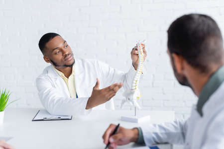 african american physician pointing at spine model near blurred colleague