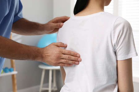 Orthopedist massaging young woman's back in clinic, closeup. scoliosis treatment