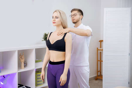 Young male physiotherapist examining young woman patient in a physic room