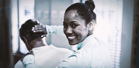 Rear view of portrait of smiling female therapist giving neck massaging to senior male patient at hospital ward