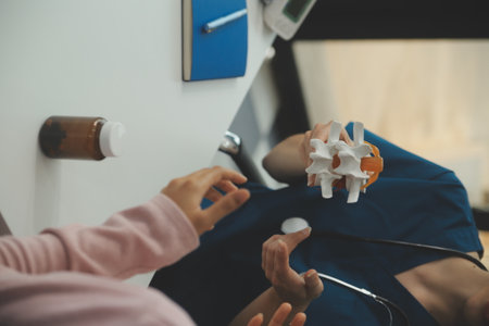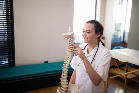 Female therapist in white coat holding spine model and stethoscope in therapy room, copy space. Medical professional, healthcare, anatomy, wellness, rehabilitation, clinical, treatment