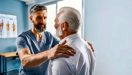 Senior male physiotherapist helping senior patient with shoulder pain in clinic