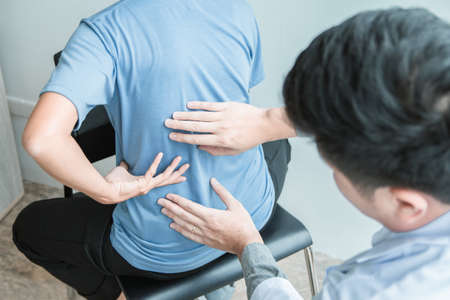 Male patients consulted physiotherapists with Low back pain for examination and treatment. Rehabilitation physiotherapy concept.