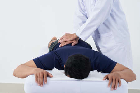 Unrecognized man acupressure specialist examining back pain in medical office