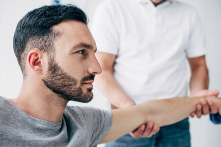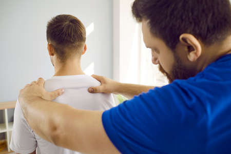 Skilled male therapist examining young mans back and appoints physiotherapeutic treatment. Close up of orthopedist examining mans back in modern health clinic. Health care concept.