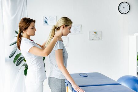 Well built Caucasian male acupressure specialist examining woman back pain in medical office