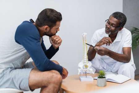 african american physiotherapist pointing at spine model near young man in consulting room