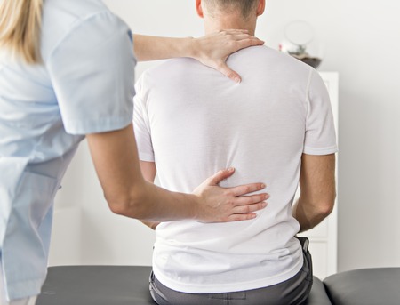 Shot of female physiotherapist working examining treating injured back of male patient while doing the rehabilitation therapy pain in clinic.