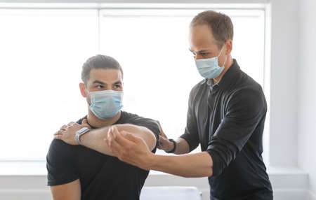 Portrait of female physiotherapist rehabilitating male patient arm. Muscle rehabilitation physiotherapy. Physiotherapist woman evaluating a patient's arm in the office