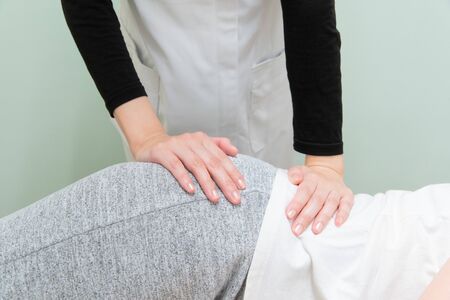 Physiotherapist massaging the belly of a young woman.Physiotherapy and recovery