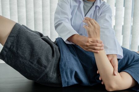 Physical therapists are checking patients elbows at the clinic office room. close up view of his hands.