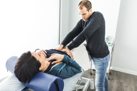 Physical therapist does manual therapy to a young athletic guy at medical office. Concept of manual therapy and osteopathy