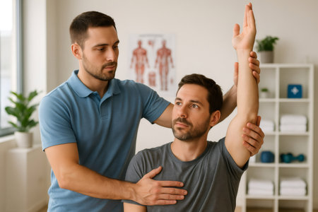 Male physiotherapist assisting a patient in stretching his arm during an engaging physiotherapy session focused on recovery and mobility