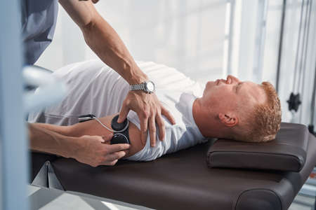 Doctor puts electrostimulator on man hand in therapy room close up