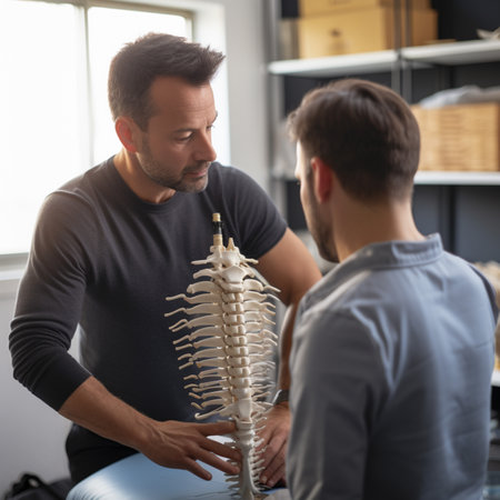 Mixed race male doctor holding skeleton explaining to patient areas of the spine