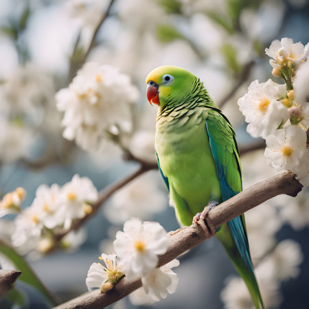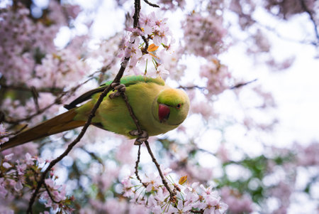 Green Parakeet Perched on Cherry Blossom Tree in London Park