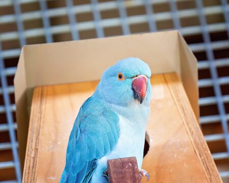 Blue parrot in a cage perched on a wooden perch inside a cozy pet shop display