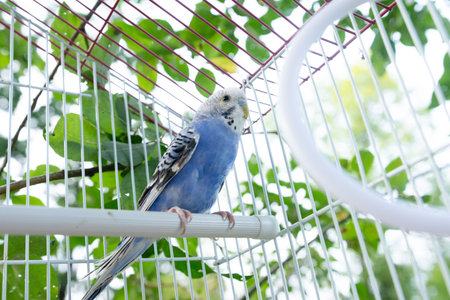A vibrant blue budgerigar rests on a perch inside its white cage. Lush green foliage forms a backdrop, sunlight illuminating the scene.