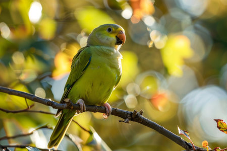 Invasive ring necked parakeet or Kramer's parakeet, perched on a tree branch in Casa de Campo, Madrid, Spain. Psittacula krameri. Vertical