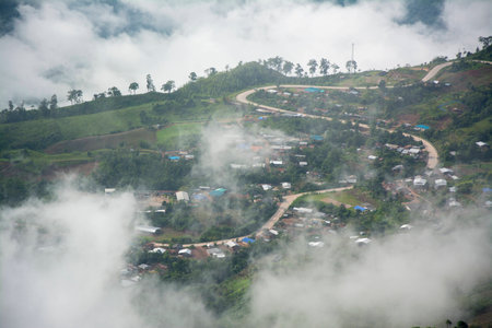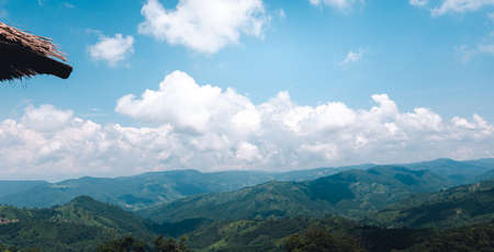 The space for text In the fog and clouds, a panoramic view of the Thai mountains.