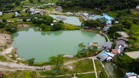 High angle view of green rice fields with different curves in the rainy season, Thailand. There are many house and green forest behind. Idea for countryside background.