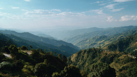 Stunning view of a mountainous landscape featuring lush green hills fading into a misty blue atmosphere under a beautiful cloudy sky, perfect for nature enthusiasts.