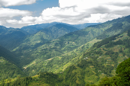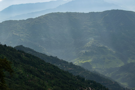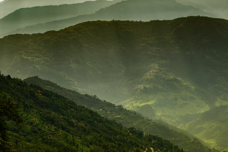 Sun rays falling on Himalayan mountain range, scenic beauty of layers of mountains, Okhrey, sikkim, India. Okhrey village a remote place in Sikkim where mountain range view is enjoyed by tourists.