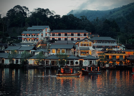 a village nestled beneath a misty mountain, showcasing the serene influence of zen buddhism. this photo captures the essence of dark and gritty cityscapes, with a touch of backlit photography. the bold chromaticity adds depth to the atmospheric portraits and shots, highlighting the beauty of buddhist art and architecture. ai generated
